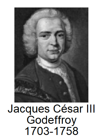 born at La Rochelle [Frankrijk] in 1670, Kaufmann, Citaat uit "Genealogie der Familie Godeffroy in Hamburg":, Cesar Godeffroy, n. 1671 zu la Rochelle, + 21. Juni 1723 als Kaufmann in Berlin. Frau Anne Le Clerc aus Metz (Tochter des emigrirten Salomon le Clerc, französischer Secretair im Handelsdepartement unter Kurfürst Friednch III von Brandenburg), vermahlt den 20. April 1700 zu Berlin. Died (Around 52 years old) at Berlijn [Duitsland] on 21 Juni 1723.