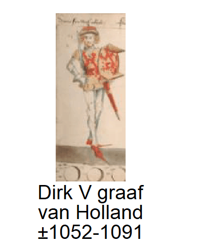 Floris I graaf van Holland. Floris I (ca. 1025 – Nederhemert, 28 juni 1061) was een Friese graaf (comes Fresonum) die van 1049 tot 1061 het bewind voerde over de gebieden die later bekend zouden worden als het graafschap Holland. Hij volgde zijn broer Dirk IV op na diens dood in 1049. De broer van Floris werd gedood door een leger van de bisschoppen van Utrecht, Metz en Luik. Graaf Dirk was kinderloos en zijn jongere broer was erfgenaam, maar moest aanvankelijk vluchten. Toen Floris eenmaal tot graaf was benoemd bleef de relatie met de keizer en de bisschoppen slecht. Floris raakte in conflict met de keizer over de tol op de Merwede (vermoedelijk bij Vlaardingen, dus stroomafwaarts van de huidige Merwede). Bovendien probeerde hij zijn bezit in het rivierenland uit te breiden en kwam daardoor in conflict met bisschop Willem van Cuijk. Regentes Agnes gaf in 1058 bisschop Willem van Cuijk van Utrecht, Hendrik II van Leuven, Wichard van Gelder, Anno II aartsbisschop van Keulen, Diederik bisschop van Luik en Egbert I van Meißen, de markgraaf van Friesland (Friesland en Groningen), opdracht om Floris tot de orde te roepen. De eerste echte slag werd in 1061 uitgevochten bij Oudheusden. Het Friese leger van Floris was zwaar in de minderheid en had daarom het slagveld met grote aantallen valkuilen voorbereid. Zo raakten zijn tegenstanders in grote verwarring en werd een groot aantal direct al buiten gevecht gesteld. Floris wist daarna de slag eenvoudig te winnen. De volgende slag vond op 28 juni 1061 plaats bij Nederhemert. Floris viel de troepen van Keulen, Brunswijk en Cuijk aan en wist ze snel te verjagen. De Friezen gingen vervolgens rusten in de schaduw van de bomen langs de Maas. Herman van Cuijk, burggraaf van Utrecht, hergroepeerde zijn troepen en overviel het nietsvermoedende leger. Floris werd samen met honderden van zijn mannen gedood. Floris is oorspronkelijk begraven in de eerste abdij van Egmond. Hij ligt nu na opgraving in het nieuwe mausoleum in de in 1935 herstichte Abdij van Egmond - hoewel eraan wordt getwijfeld of het in 1935 gevonden skelet wel van Floris was. Floris trouwde met Geertruida van Saksen. Zij was de dochter van Bernhard II, hertog van Saksen, en Eilika van Schweinfurt. Hun kinderen waren: Dirk V van Holland (1054-1091); Floris, jong overleden te Luik, waar hij mogelijk naartoe was gestuurd voor zijn opvoeding; Bertha van Holland (ca. 1058-1094), gehuwd met Filips I van Frankrijk; mogelijk Adelheid (1045-1085), gehuwd met Boudewijn I van Guînes.